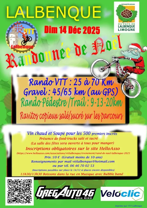 VTT Lalbenque organise sa 5° rando de Noël (VTT, Gravel, Marche, Course à pied) avant les vacances de Noël. Ce sera le dimanche 14/12 à 7h30. Cette année la Rando sera organisée avec l'aide du Cyclo Labastide Marnhac.