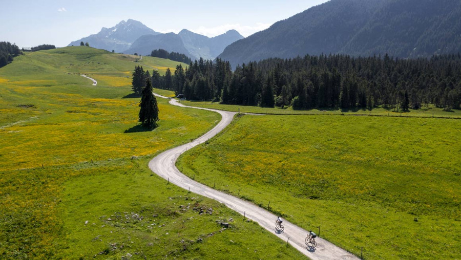 La montée exigeante mène à une superbe piste d’alpage gravillonnée qui traverse le plateau et offre une ambiance unique entre pâturages et panoramas ouverts. Un parcours exigeant mais mémorable pour les amateurs de défis en gravel.