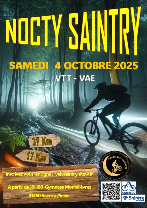 L’ACCS organise pour sa deuxième édition une randonnée nocturne VTT, balisée par des flèches retro réfléchissantes. Nouveauté cette année Nocty Saintry fait partie de la ronde des Nocturnes : 3 randos nocturnes pour plus de plaisir avec lots au tirage au sort pour les plus fidèles !Les parcours sont ouverts à toutes et tous, licenciés ou non, avec vélo à assistance électrique (VAE) ou musculaire, à allure libre, chacun individuellement ou en groupe découvrira la forêt de Rougeau dans une autre ambiance !.