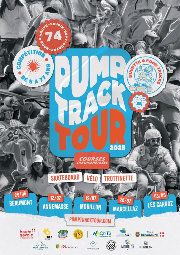 Le Pump Track Tour, une compétition Made in Haute-Savoie Le Pump Track Tour, c’est la tournée estivale des pump tracks de Haute-Savoie. 5 spots, 1 tour de Haute-Savoie, 3 disciplines Pas besoin d’envoyer des flips de l’espace : ici, on ride avant tout pour le chrono et le plaisir. Du 29 juin au 3 août, on t’attend sur 5 pump tracks en Haute-Savoie pour partager des sessions bien cool. Quel que soit ton âge ou ton niveau, tu as ta place sur la piste.