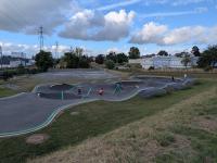 Super Pumptrack, par UGtracks. Bonnes courbes, belles bosses, bien roulant en surfskate. Attention, il est "caché" derrière le gymnase, on ne le voit pas de la route