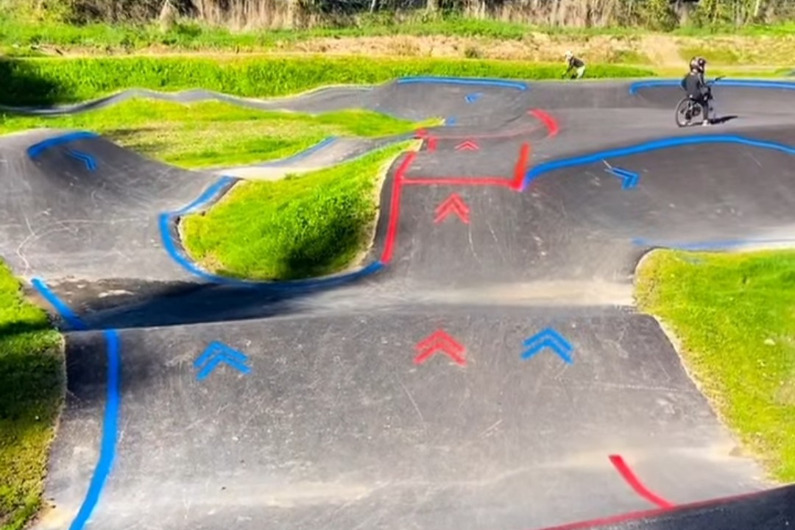 un grand pumptrack avec une boucle verte indépendante , une bleue et une rouge qui se rejoignent. la ligne rouge est sympa avec des enchainement dans le virage mais quelques bizarreries dans certaines trajectoires d'après moi. moins de possibilité de prendre de l'amplitude sur les saut qu'au PT de saint marcellin a une dizaine de minutes.